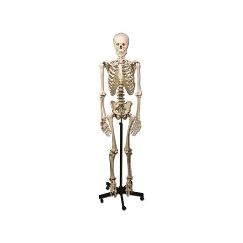 Replica di uno scheletro umano di dimensioni reali. Illustra tutte le componenti dello scheletro in maniera dettagliata. Il prodotto è assemblato a mano per garantire una precisa riproduzione dei dettagli più complessi ed un utilizzo durevole. Le giunture principali sono snodabili, mentre gli arti superiori ed inferiori sono facilmente rimovibili. Le parti seguenti sono staccabili: calotta cranica, cranio, mandibola, braccia e gambe. Fornito con base d’appoggio su 5 ruote.