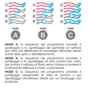 MODE A: la sequenza del programma prevede il gonfiaggio e lo sgonfiaggio del gambale un settore per volta, per effettuare un massaggio attivante, ideale prima della gara o dell’allenamento.