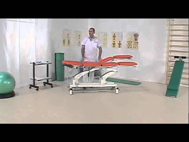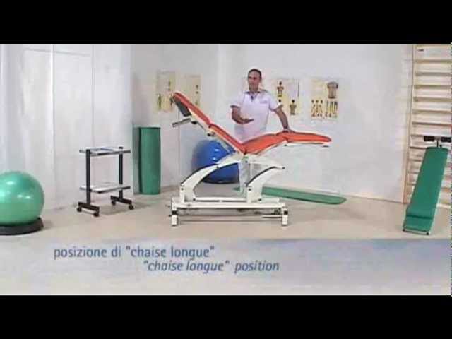 Il lettino ha otto sezioni mobili. La sezione del tronco è regolabile elettricamente con la pulsantiera fissa; le altre sezioni sono regolabili con sistema servoassistito da una o più molle a gas.
