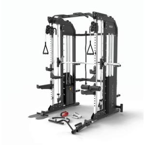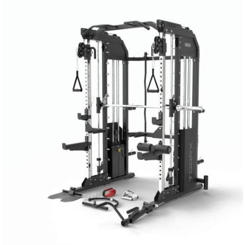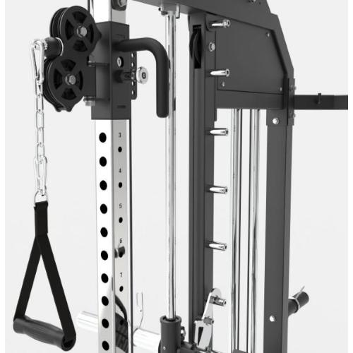 STATION 3 EN 1 - DOUBLE POULIE, SMITH MACHINE, RACK - 2x90 kg en acier - BARRE DE 1944 mm - Barre de traction multiprises - Barres parallèles - Support pour barre - 4 supports de disques ø50 mm - 4 supports de disques à ressort ø49 mm - 2 supports de disq