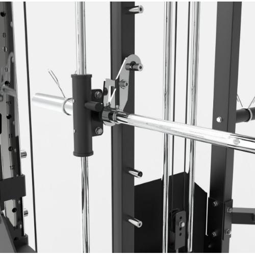 1944 mm, coulisse à roulement à billes, 2 crans de sécurité avec crochet réglable, réglable sur 11 positions (539 à 1861 mm), pas de 150 mm. Diamètre du support de disque : 50 mm. Système breveté de fixation de la barre aux colonnes de poids.